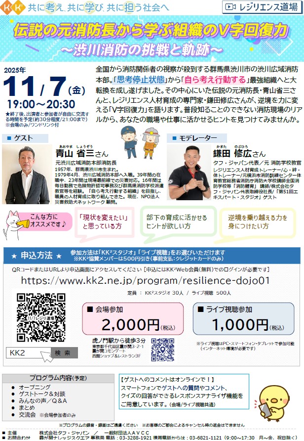 全国から消防関係者の視察が殺到する群馬県渋川市の渋川広域消防本部。「思考停止状態」から「自ら考え行動する」最強組織へと大転換を成し遂げました。その中心にいた伝説の元消防長・青山省三さんと、レジリエンス人材育成の専門家・鎌田修広さんが、逆境を力に変える「V字回復力」を語ります。普段知ることのできない消防現場のリアルから、あなたの職場や仕事に活かせるヒントを見つけてみませんか。